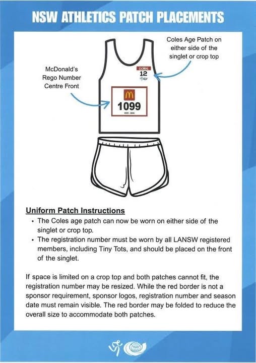 Registration number (bib) must be sewn or pinned to the front of the singlet or crop top. The registration number is placed in the centre of the singlet/crop top (with the full red border showing), age patch on either side of the top.